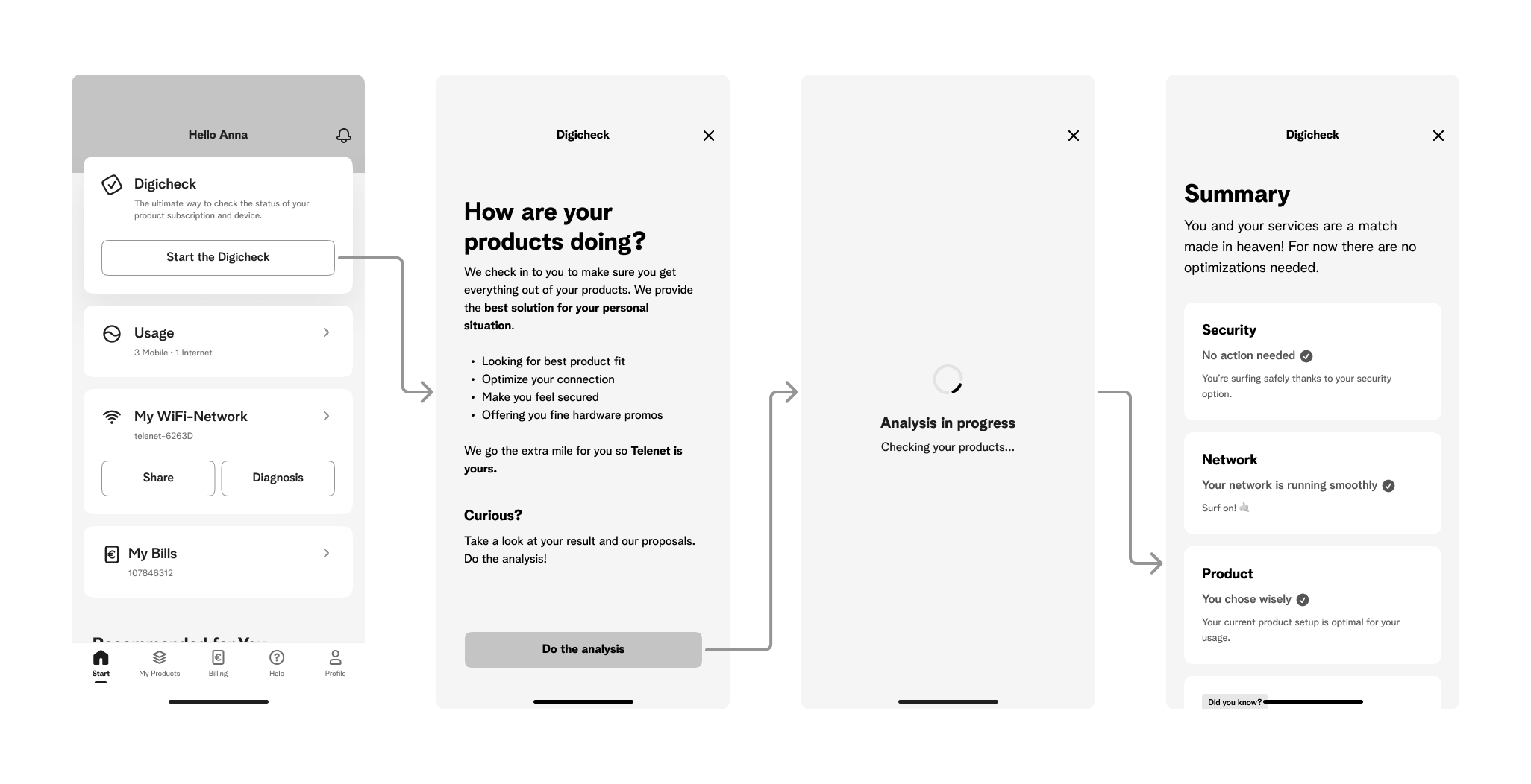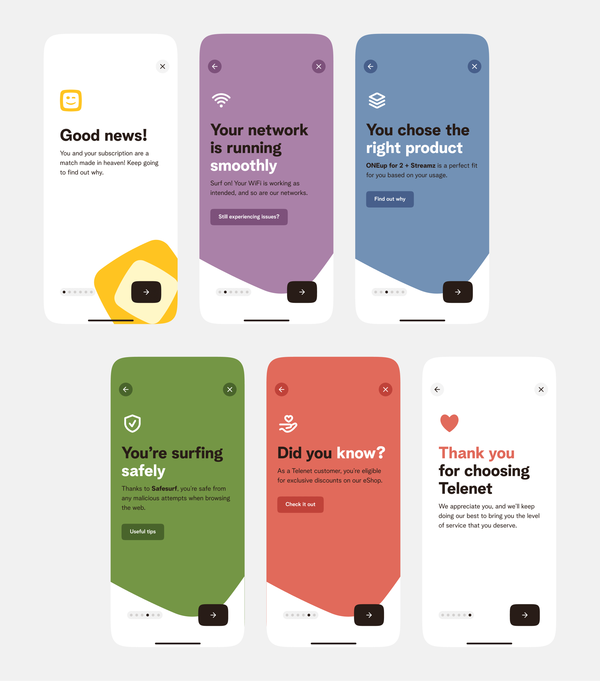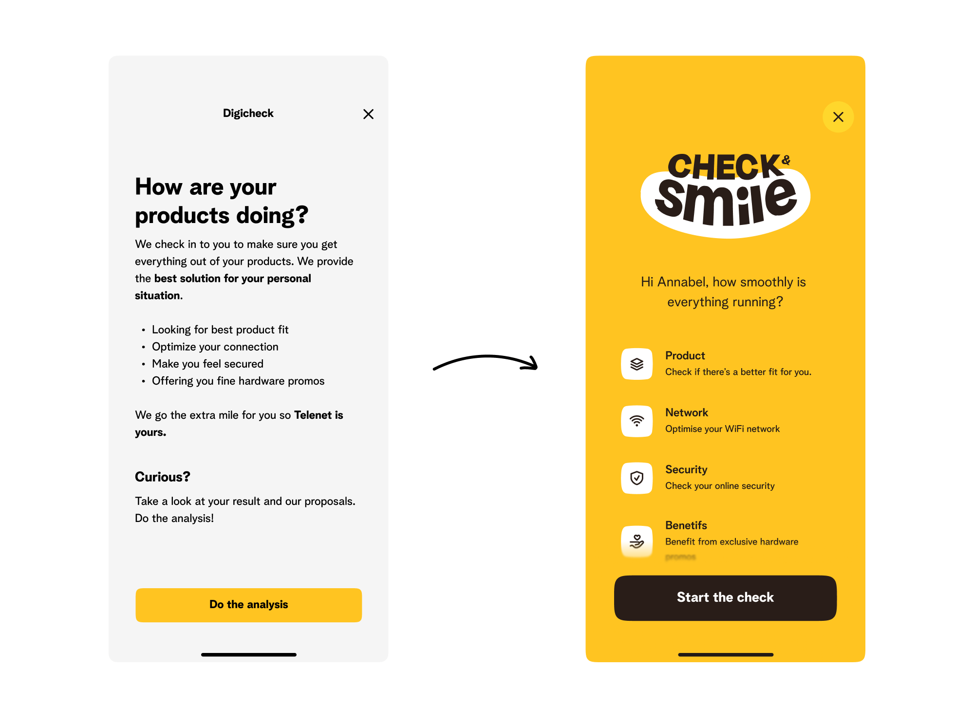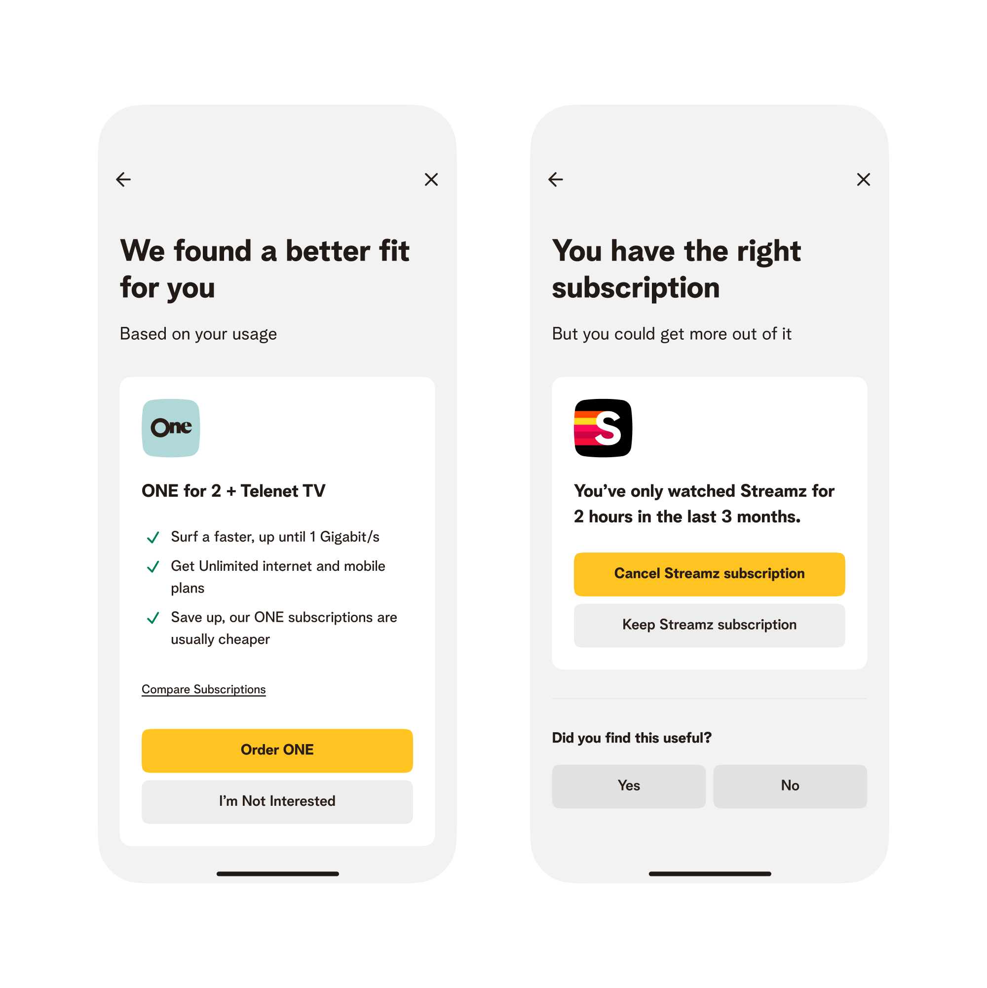 In the public eye, Telenet had very low confidence and a bad reputation. Net Promoter Scores were low and churn rate were as high as ever. It was evident that we needed to regain the customer’s trust. Check & Smile was intended to do exactly that, by providing a human-centred feature that would suggest plans and options based on a personalised propensity model. Even if it meant suggesting downgrading to lower tier because a customer is paying too much for their personal usage.